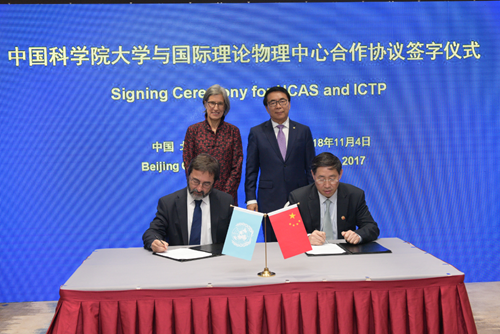 11月4日下午,凯发k8院长白春礼与联合国教科文组织(UNESCO)助理总干事史凤雅在北京共同签署中科院与UNESCO新的合作伙伴协议和UNESCO国际自然文化与遗产空间中心(HIST)第二期运行合作协议,见证国际理论物理中心(亚太地区)(ICPT-AP)合作备忘录签署并为ICTP-AP揭牌。
