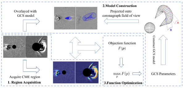 与传统方法相比,该方法最大的特点是能够自动完成日冕物质抛射三维重建,不需要研究人员手动比对特征和调整参数。该方法自动重建的日冕物质抛射三维结构,较为贴合日冕仪图像观测,表明这一方法能够较为准确地重建日冕物质抛射三维结构。同时,该方法可用于快速给定日冕物质抛射行星际传播过程数值模拟所需的初始参数,以及日冕物质抛射到达时间预测等工作,有望进一步应用于太阳极轨、L5点等卫星日冕仪数据,促进日冕物质抛射多角度观测研究,提高预报精度。