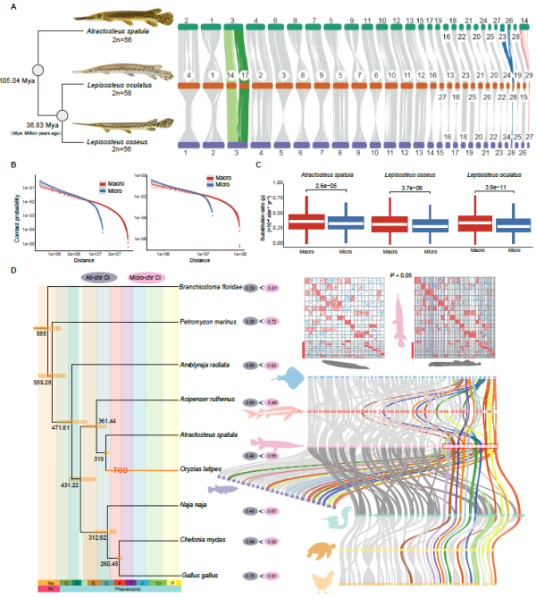团队基于鳄雀鳝与长吻雀鳝的染色体级基因组,发现两个属鱼类在染色体结构上存在融合事件,并具有保守性。研究发现,两个属鱼类在分化超过1亿年后,依然有83.35%的基因组完全一致,且基因组大小差异大多数源于单碱基的插入/缺失,而非大规模结构变化。研究进一步指出,微染色体结构比大染色体稳定,且明显富集于DNA修复与细胞凋亡相关基因,演化速率缓慢,染色体重排率仅约0.5次/百万年。同时,两个属鱼类与四足动物的基因组相似度,甚至高于近缘的真骨鱼类,且转座元件的产生率与活跃度在脊椎动物中最低,团队推测,其低活性是维持基因组稳定性的重要原因。
