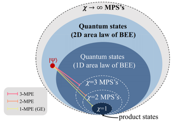 基于张量网络,研究团队将矩阵乘积态作为参考流形,提出了全新的多体纠缠度量方法,引入了新的物理量——特定χ矩阵乘积纠缠(χ-MPE)。该方法的核心思想是:与传统几何纠缠仅考虑与乘积态流形的距离,以及难以有效反映多体纠缠的复杂结构不同,χ-MPE将目标量子状态与“最优”的张量网络状态进行比较。这里的“最优”是指目标状态与具有特定虚拟维度χ的MPS流形之间的最小保真距离。换言之,该方法不是直接衡量一个状态有多么“纠缠”,而是看它与“最接近的”、复杂度受限的量子状态有多远的距离。当χ=1 时,MPS就退化成最简单的“乘积态”,这时χ-MPE就变成了“几何纠缠”,它衡量的是与完全没有纠缠的状态间的距离。随χ的增大,流形覆盖的纠缠态范围逐步扩展,χ-MPE衡量的是与更复杂、但仍受限于特定复杂度纠缠态之间的距离。