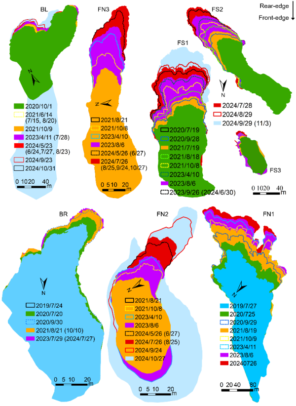 2019年—2024年间,研究区热融滑塌整体呈持续扩张趋势,活动期集中在每年6月至10月,其中9月至10月最为剧烈;滑塌面积年均扩张约1182.9平方米,月均扩张约505.7平方米,其后缘后壁年均后退14.5米,月均后退6.2米。同时,研究精准量化了滑塌体内部地表物质的运动速率,明确了该速率自后缘向前缘呈递减规律,揭示了后缘后退与下坡物质搬运之间的紧密力学关联。