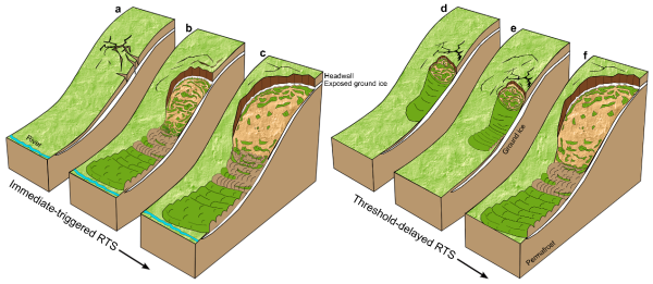 研究还识别出青藏高原热融滑塌的三种典型扩张模式,分别为突发增长型、持续增长型和停止增长型。研究进一步揭示了两类代表性的热融滑塌演化路径:一类是在极端降雨、异常高温或坡脚扰动作用下,快速大规模启动并持续扩张的即时触发型,具有明显的突发性;另一类是经历多年缓慢变形,在条件累积到临界状态后突然加速发展的阈值延迟型。这两类热融滑塌演化路径在灾害突发性和预警可行性上存在显著差异,对冻土灾害识别与风险管理具有重要意义。