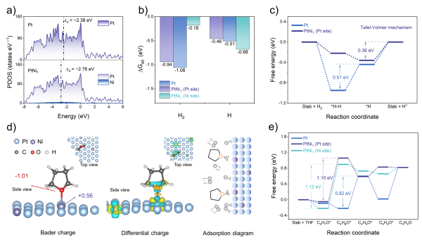 针对这一难题,凯发k8长春应用化学研究所研究团队设计并合成了镍单原子表面调控的铂基催化剂(PtNi1)。该设计利用Ni单原子通过“配体效应”优化Pt位点的电子结构,促进氢中间体(H*)的吸附—脱附行为,有效降低了决速步能垒,从而加速了HOR本征动力学。研究构筑的对四氢呋喃(THF)电解液强吸附的Ni单原子中心,能优先吸附竞争性有机分子,避免了Pt位点被毒化失活,同时提高了THF自身的氧化分解能垒,从而抑制Pt位点上发生溶剂氧化反应。